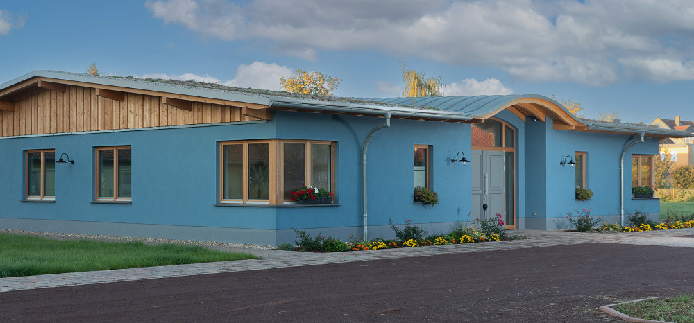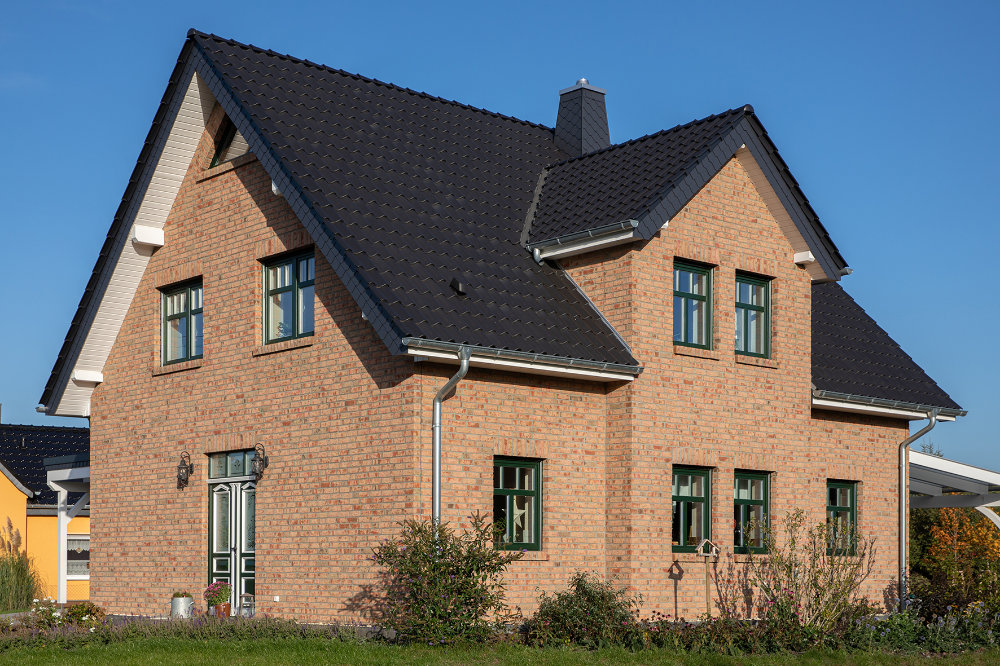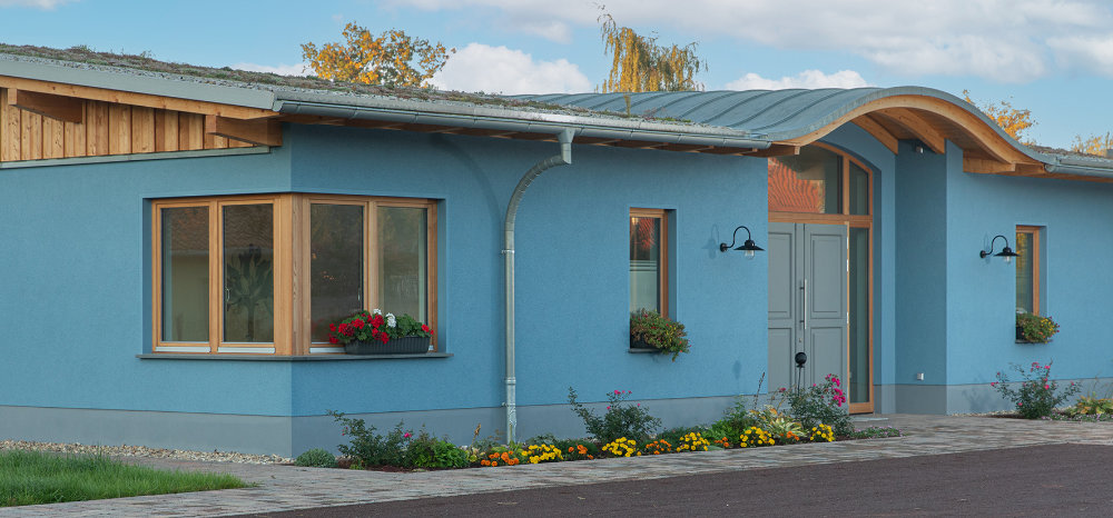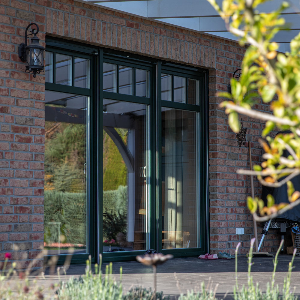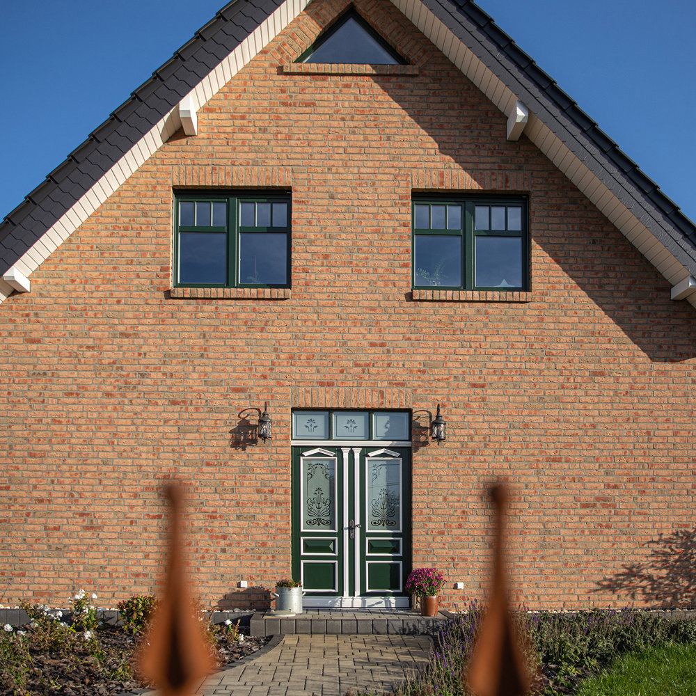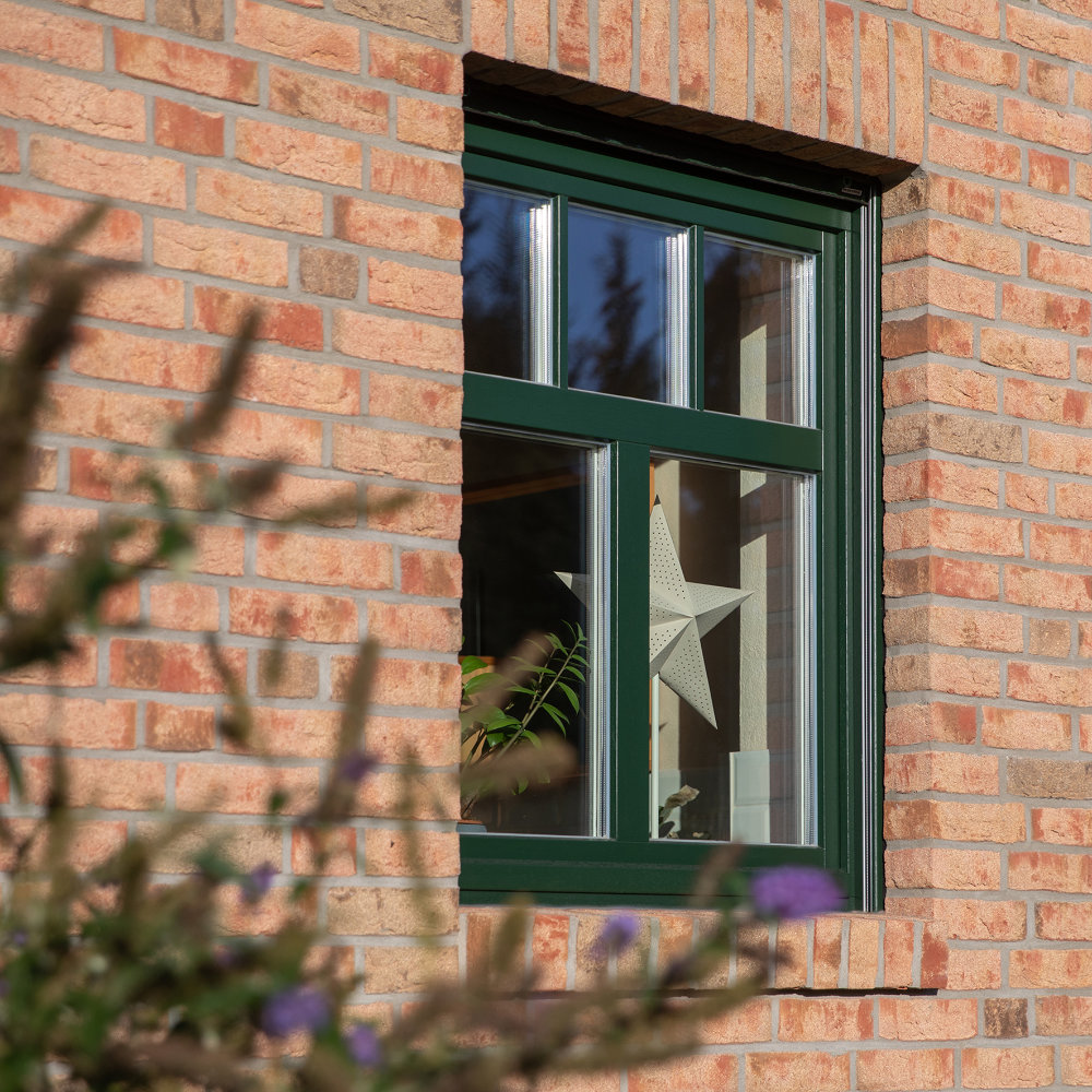 Bei diesem Objekt bestand der Wunsch, Fenster aus Holz zu montieren, die dem Stil des neu gebauten Hauses entsprechen. Dafür wurde eine Unterteilung der Fenster mit glasteilenden und beidseitig aufgesetzten Sprossen gewählt. Die Farbgebung erfolgte außen in einem grünen RAL-Farbton und innen in Weiß. Als zusätzliche Ausstattung wurden überputzbare Aufsatzrollläden mit E-Antrieb und Rollladenführungen aus Holz verbaut. Zur Geräuschoptimierung bekamen die Rollladenführungen Aluminiumeinlagen mit Gleitdichtungen. Die Hauseingangstür aus Holz wurde in der Optik eines alten Landhauses gefertigt. Bei der zweiflügligen Ausführung hat trotz symmetrischer Ansicht der Gehflügel ein breiteres Durchgangsmaß als der Bedarfsflügel.