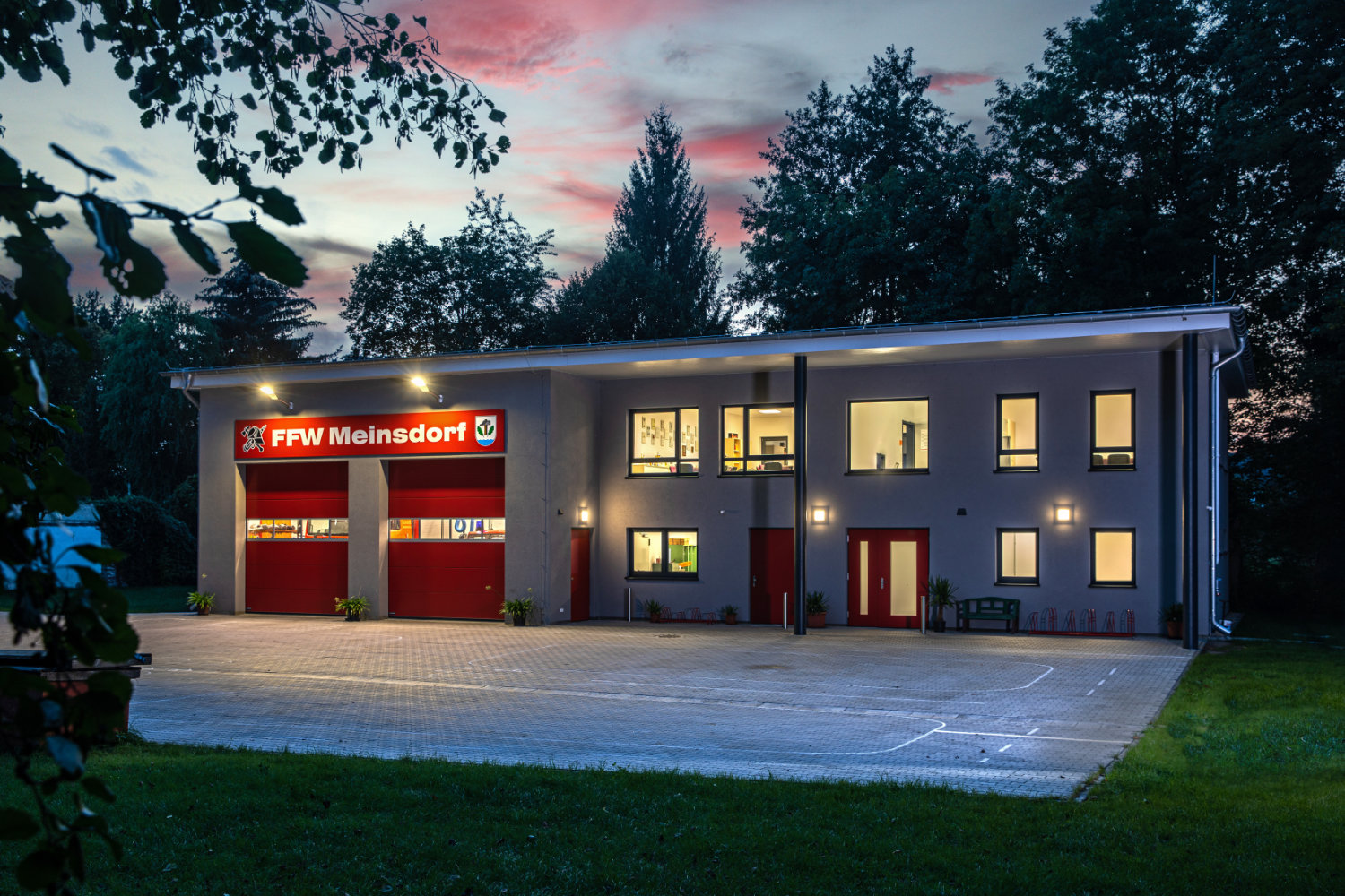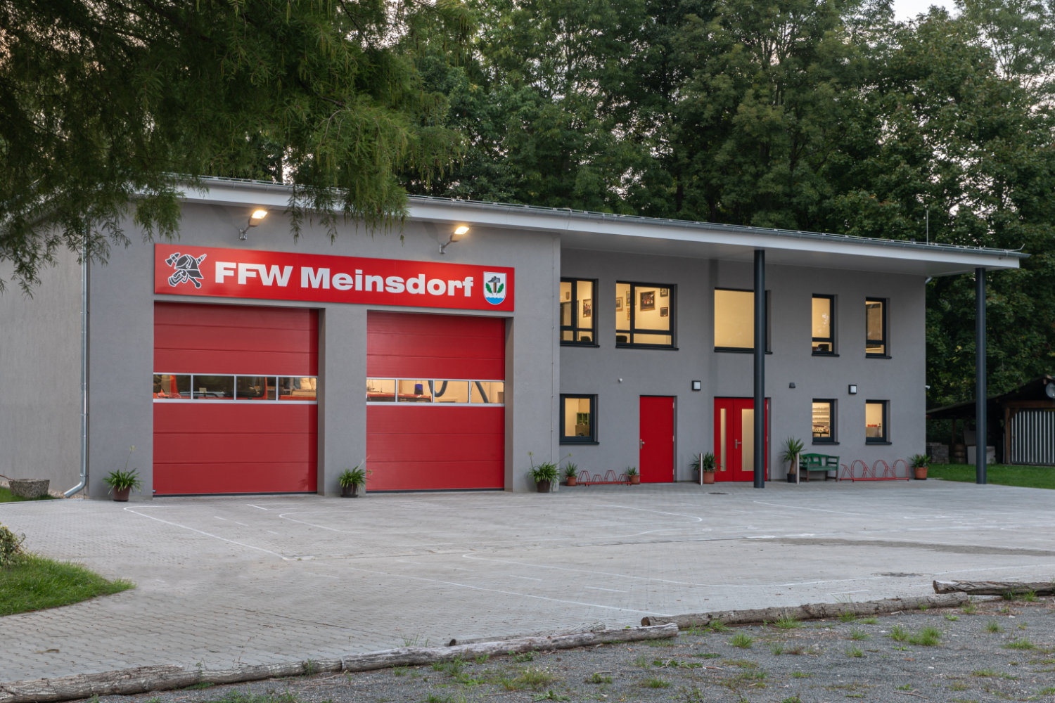 Für dieses Gebäude wurden pflegeleichte und langlebige Fenster aus Kunststoff gewählt. Ausführung beidseitig foliert in RAL 7016 anthrazitgrau mit 3-fach-Verglasung Ug 0,6. Die Türen wurden aus Holz gefertigt, in einer Variante mit einem glatten Türblatt und innenliegender Stahlverstärkung. Vorteil: sehr stabil, guter Einbruchschutz und die problemlose Widerherstellung des Originalzustandes bei eventuellen Beschädigungen. Als Tore kamen Industrie-Sektionaltore in der für Feuerwehren geforderten Spezifikation der Firma Teckentrup zum Einsatz. Zusätzlich mit durchgehendem Lichtband.