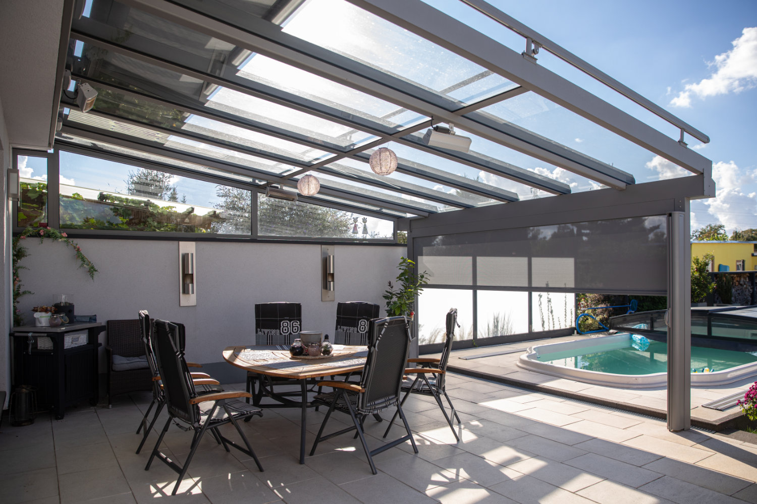 Bei diesem Objekt sollte die bestehende Sitzecke einen Sonnen- und Wetterschutz bekommen. Die Lösung war ein Terrassendach mit überstehenden Sparren und Anbindung an den Dachkasten. Die Dachverglasung erfolgte mit 10 mm Verbundsicherheitsglas. Als Verschattung kam eine Wintergartenmarkise als Aufdachmontage, eine ZIP-Markise und eine Seitenmarkise zum Einsatz. Wintergartenmarkise und ZIP-Markisen werden über Funkhandsender bedient und haben eine Steuerung für Sonne, Wind und Regen.