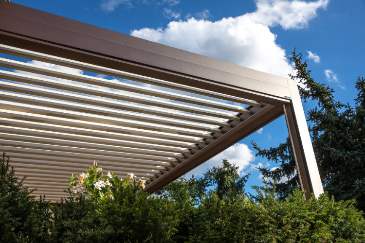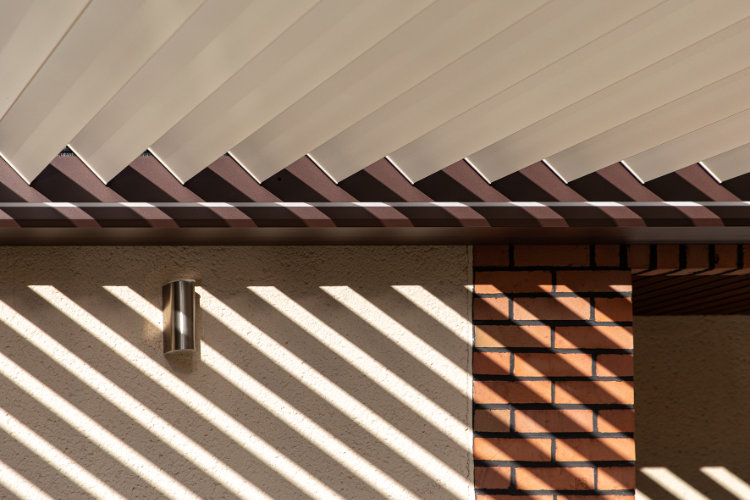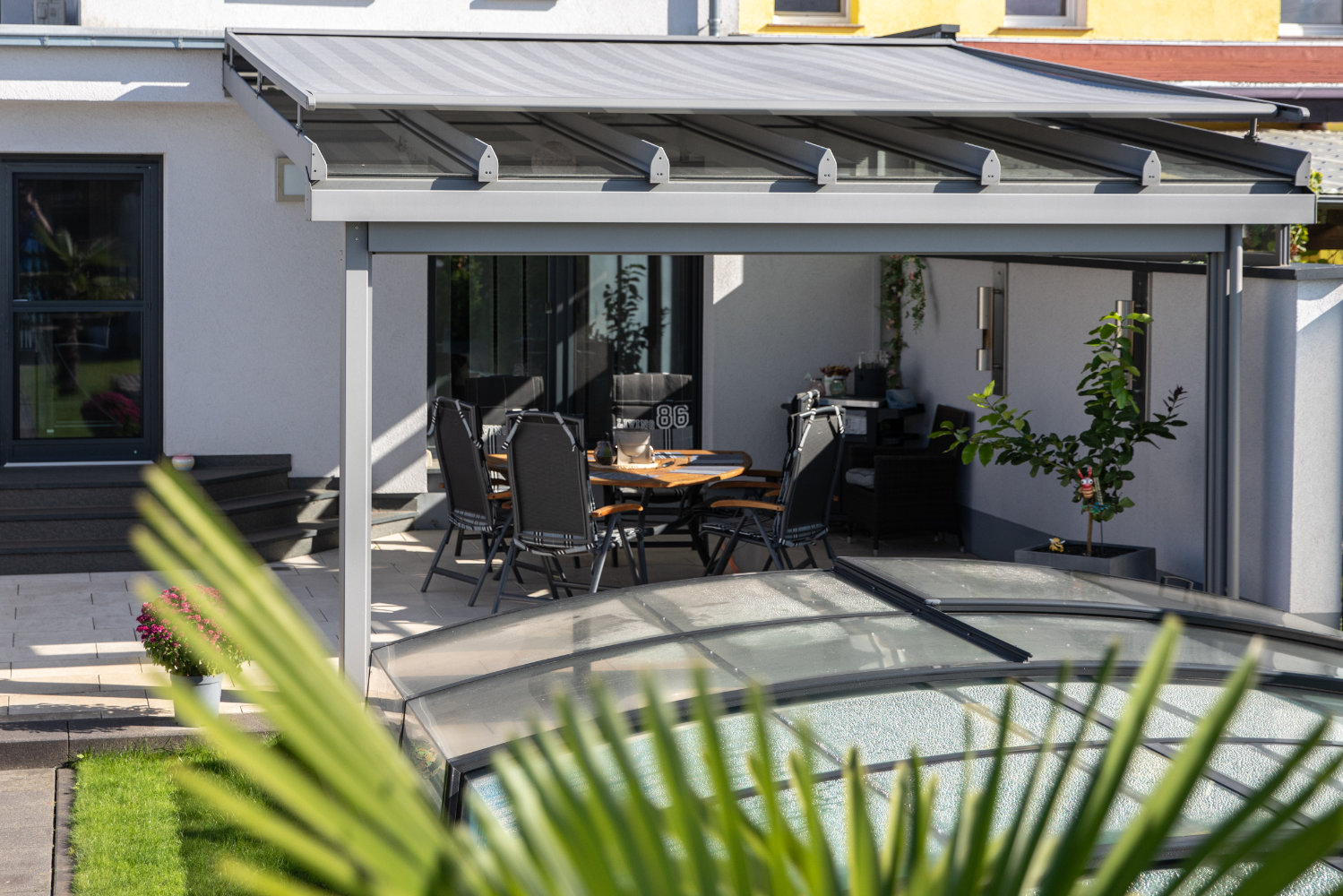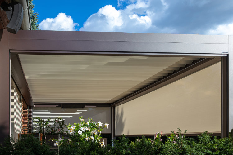 Die vorhandene Terrasse sollte nachträglich einen optimalen Sonnen- und Wetterschutz bekommen, ohne dass in der dunkleren Jahreszeit ein großer Lichtverlust für die abgeschatteten Fenster entsteht. Die Lösung war ein Lamellendach L70 mit dreh- und verfahrbaren Lamellen. Damit konnte der Lichtverlust deutlich verringert werden. Eine weitere Besonderheit war die Montage der Pfosten auf einer bestehenden Terrasse mit Natursteinbelag und massiven Untergrund, wodurch keine zusätzlichen Fundamente notwendig waren. Mit der verdeckt liegenden Befestigung im Pfosten entstand eine cleane Optik. Zusätzlich wurde der Nutzeffekt noch durch dreiseitige ZIP-Markisen und einen Design-Heizstrahler für die kühleren Sommerabende erhöht. Die vom Endkunden ausgewählte, zum Haus passende, Farbgebung finden wir sehr gelungen.