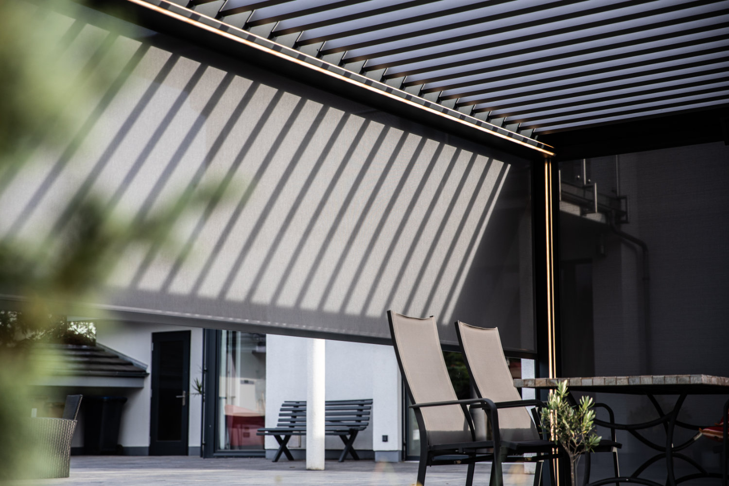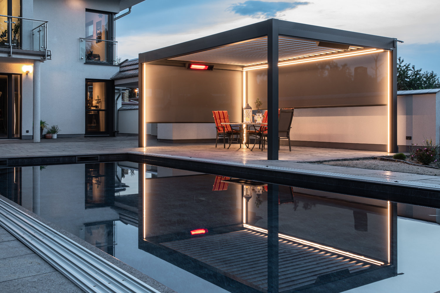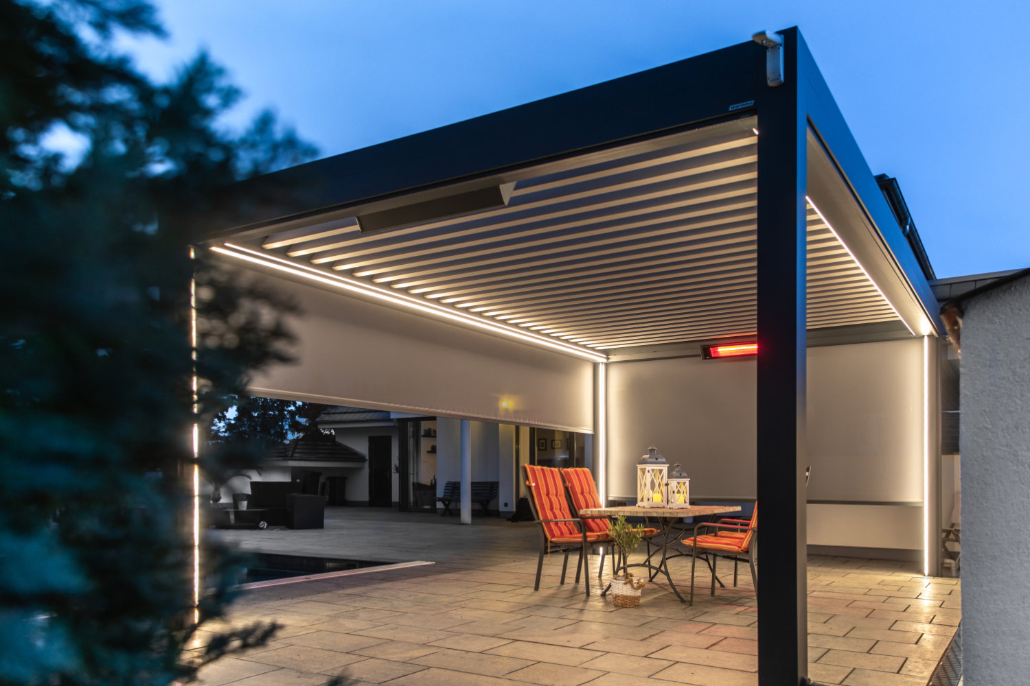 Diese Familie hatte sich für Ihren Außenbereich einen attraktiven Sonnen- und Wetterschutz gewünscht. Die passende Lösung war ein freistehendes Lamellendach L60. Hier besteht die Möglichkeit je nach Witterung die Lamellen so zu stellen das man entweder die Sonne genießen kann, im Schatten sitzt oder bei komplett geschlossenem Dach der Schutz vor Regen gewährleistet ist. Die 4-seitigen integrierten ZIP-Markisen dienen entweder zur Abschattung oder als Wetterschutz um in Verbindung mit den beiden Heizstrahlern den schicken Sitzplatz auch bei kühlerer Witterung zu nutzen. Ein zusätzliches Highlight sind die dimmbaren LED-Beleuchtungen in den Traversen und Pfosten.