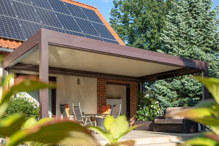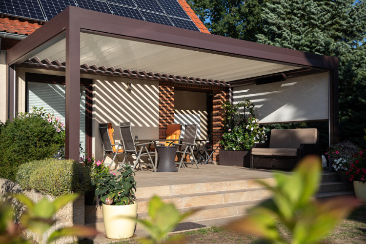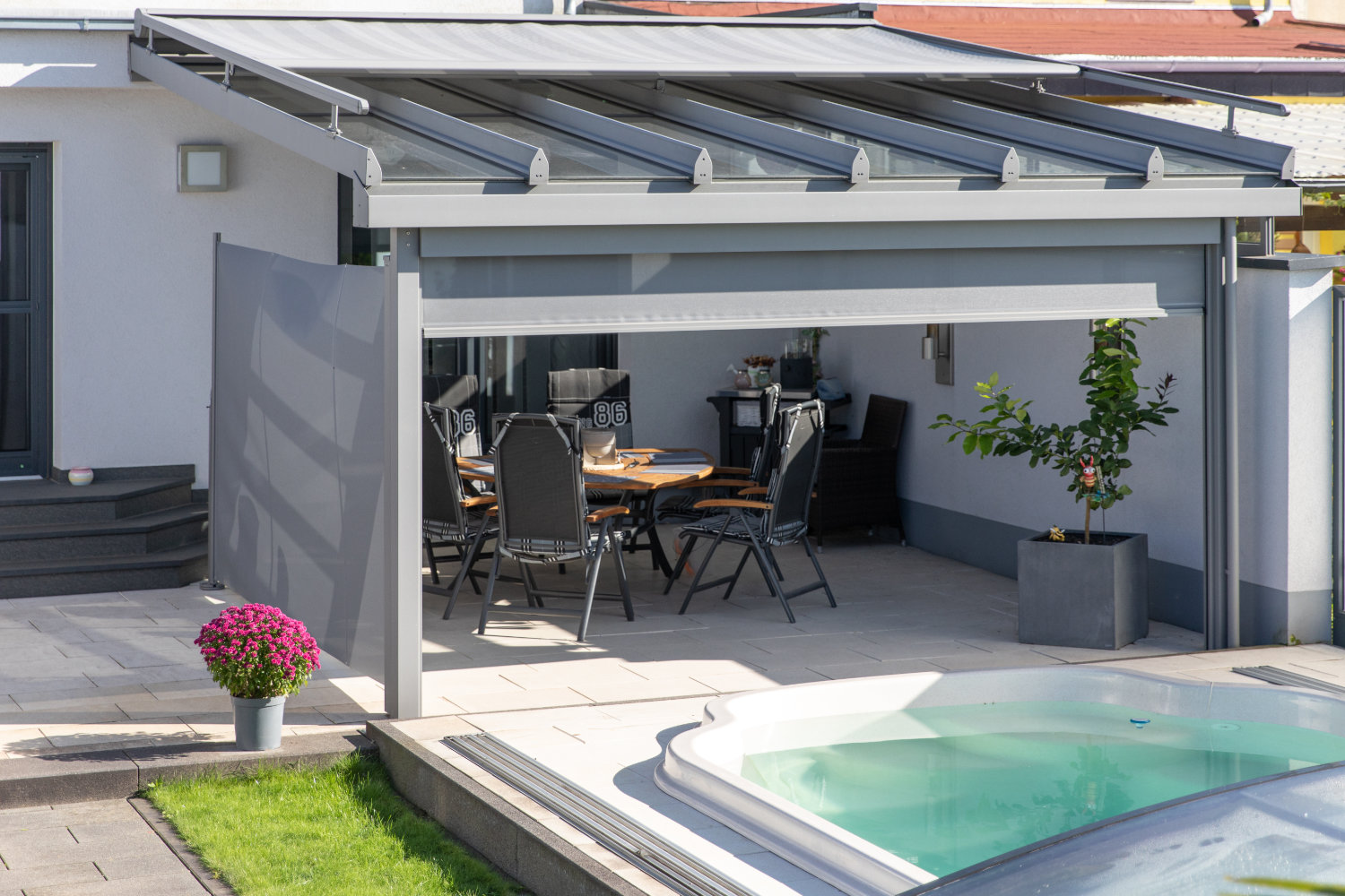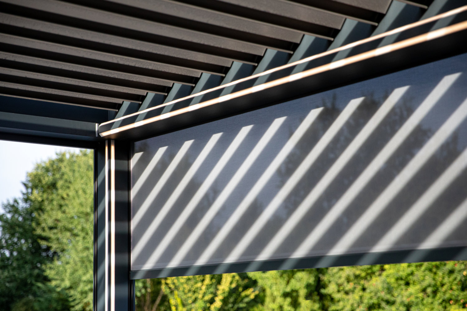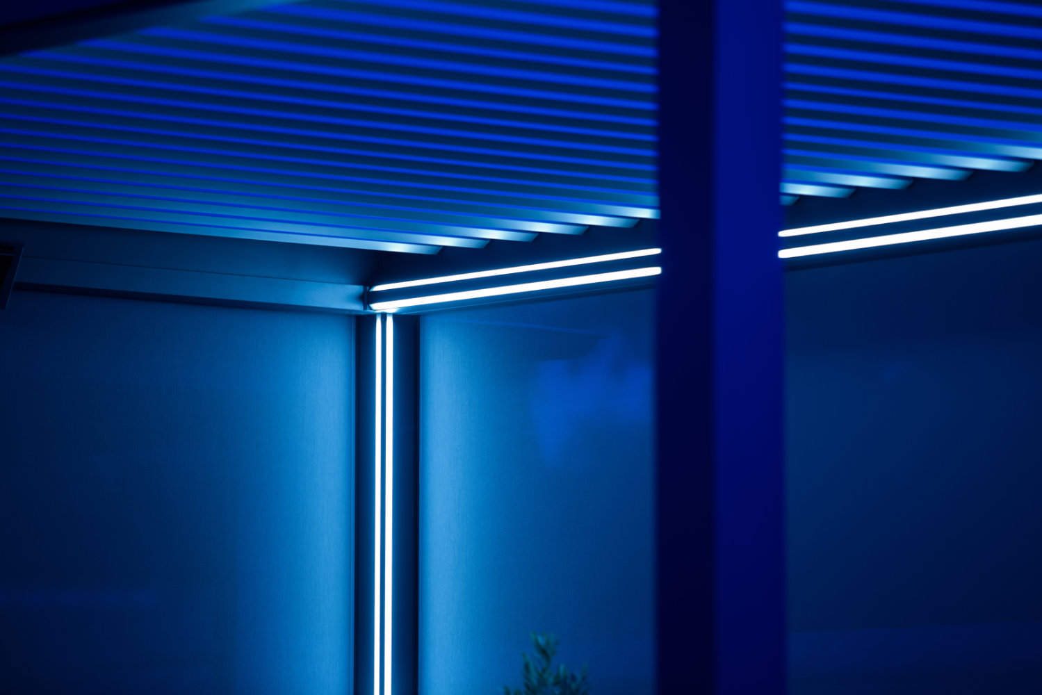 Diese Familie hatte sich für Ihren Außenbereich einen attraktiven Sonnen- und Wetterschutz gewünscht. Die passende Lösung war ein freistehendes Lamellendach L60. Hier besteht die Möglichkeit je nach Witterung die Lamellen so zu stellen das man entweder die Sonne genießen kann, im Schatten sitzt oder bei komplett geschlossenem Dach der Schutz vor Regen gewährleistet ist. Die 4-seitigen integrierten ZIP-Markisen dienen entweder zur Abschattung oder als Wetterschutz um in Verbindung mit den beiden Heizstrahlern den schicken Sitzplatz auch bei kühlerer Witterung zu nutzen. Ein zusätzliches Highlight sind die dimmbaren LED-Beleuchtungen in den Traversen und Pfosten.