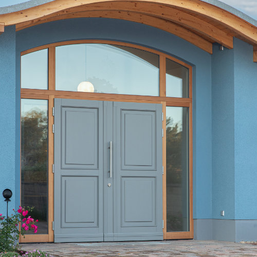 Bei dem Neubau einer Arztpraxis lag das Augenmerk auf nachhaltigen Holzfenstern aus Lärche mit einer möglichst naturbelassenen Oberfläche. Dies wurde erreicht, indem die Fensterelemente und der Türrahmen mit einem speziellen Holzöl endbehandelt wurden. Die Türblätter wurden aufgrund der höheren täglichen Belastung der Oberfläche in einem RAL-Farbton behandelt und setzen damit nochmal eine farblichen Akzent. Um die Stabilität der doch recht großflächigen Eingangstür zu gewährleisten, wurden innen aufgesetzte Statik-Profile, ebenfalls aus geölter Lärche, verbaut.